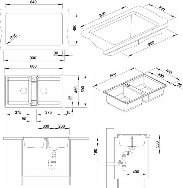 Te encantará el interesante y elegante color aluminio. Blanco Zia 9 está diseñado para el montaje sobre encimera o armarios con una anchura mínima de 900 mm. Las dimensiones totales del fregadero son 860 x 500 mm, de los cuales las dimensiones de ambas cubetas son 2x 375 x 450 mm. Las cubetas son de una profundidad excepcional, de 220 mm.