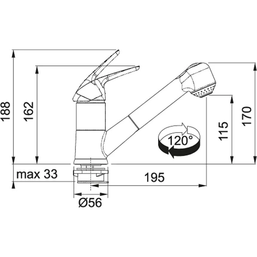 Este producto de la gama de grifería Franke tiene una manguera de ducha de 1200 mm. Tiene un cartucho cerámico en el interior y la superficie del grifo tiene un acabado de cromo brillante. Práctico es el caño giratorio 120°, la altura del grifo es de 188 mm.