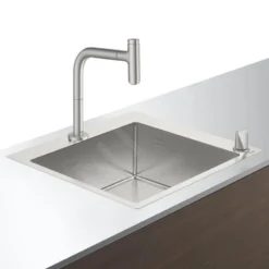 El fregadero está soldado a mano, gracias al acero inoxidable de 1 mm de grosor y a la parte reforzada para montar el grifo, es muy estable. El acero inoxidable no sólo es fuerte, sino también resistente a sustancias agresivas como los ácidos de la fruta, además de ser resistente a la corrosión, higiénico y capaz de soportar altas temperaturas. La instalación empotrada crea una transición continua entre el fregadero y la encimera. El rebosadero está discretamente colocado en la parte lateral. El fregadero tiene un diseño minimalista y, gracias a sus bordes precisos y esquinas redondeadas, se convierte en un accesorio de cocina de calidad que servirá durante muchos años.