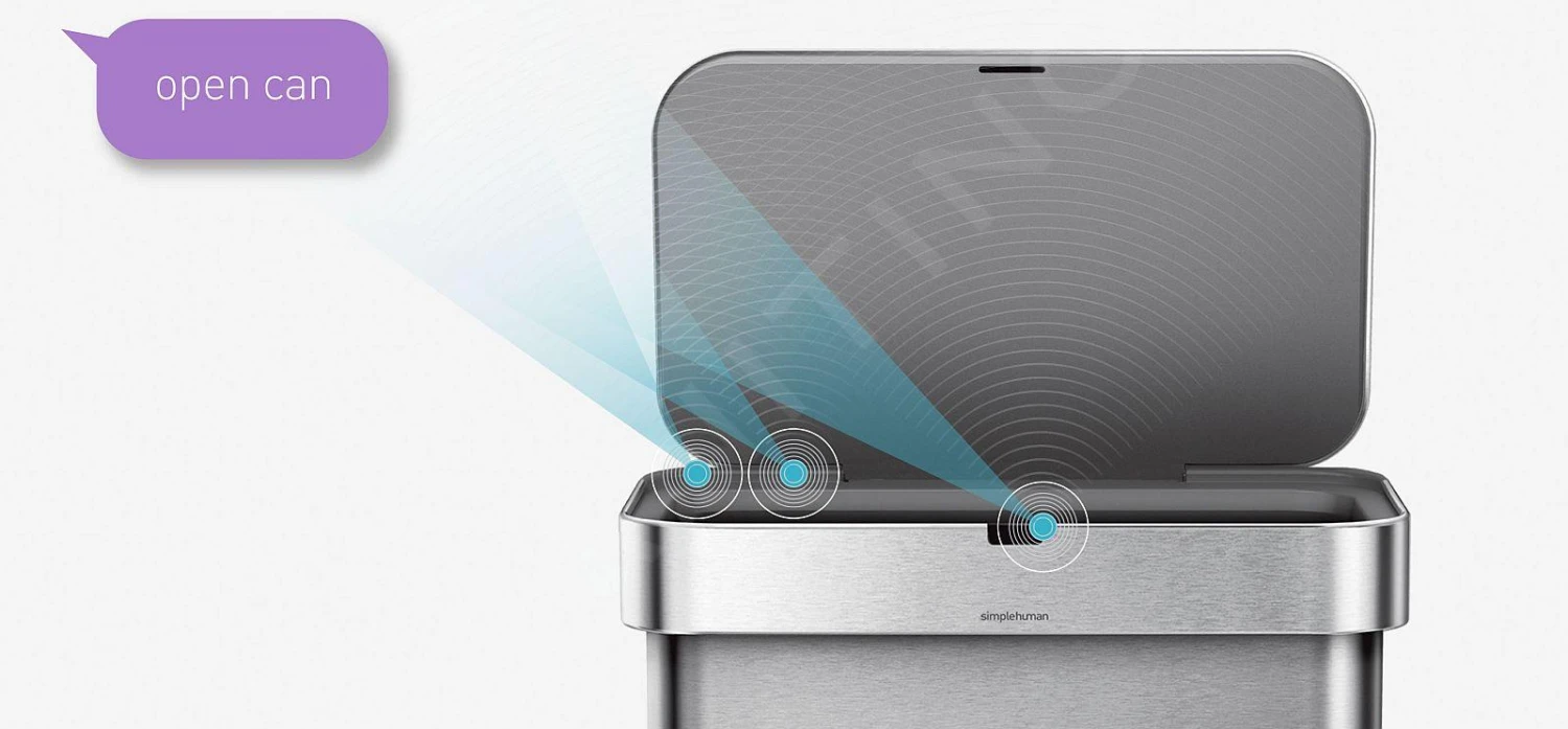 - con sensor de voz que responde a «open can» para abrirlo, «stay open» para abrirlo durante más tiempo y «close can» para cerrarlo